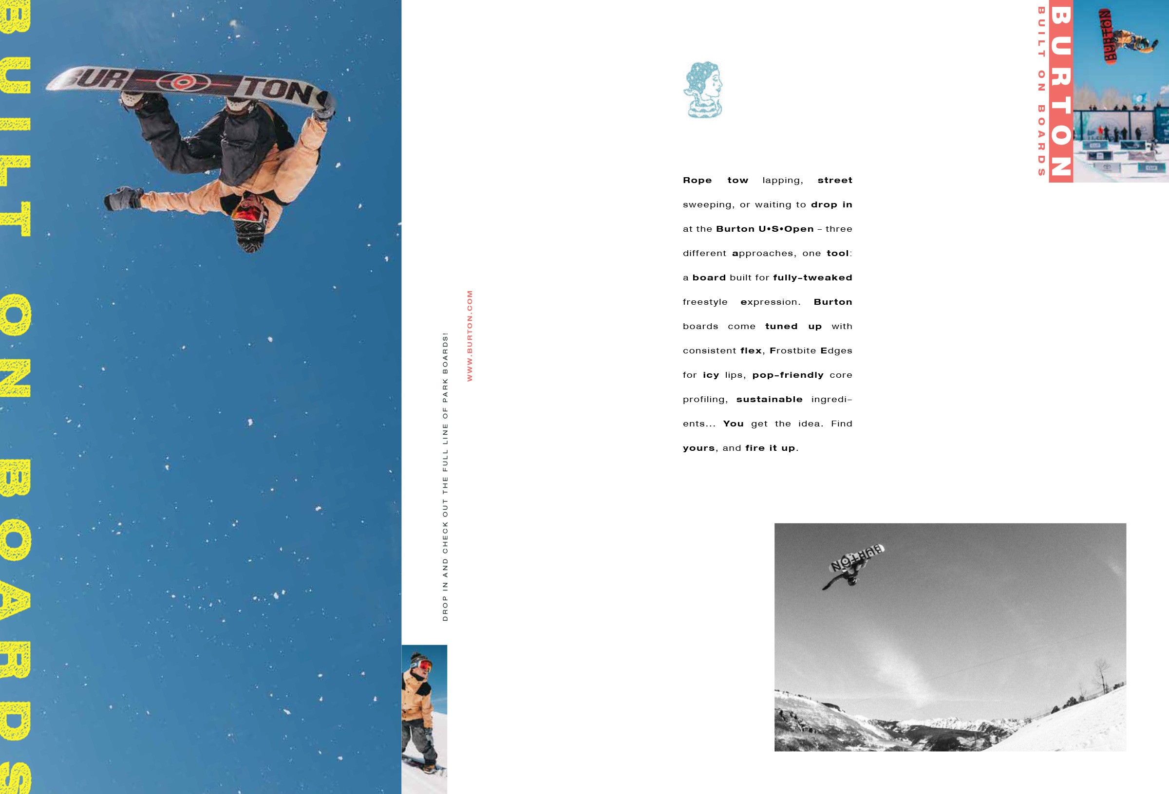 As the Senior Global Creative Director, I spearheaded the global brand vision, led the internal team, and drove all creative and marketing projects with Burton’s signature irreverent brand language. My role was to ensure every campaign, visual, and experience echoed the thrill and freedom of snowboarding, blending innovation with a relentless passion for the sport.